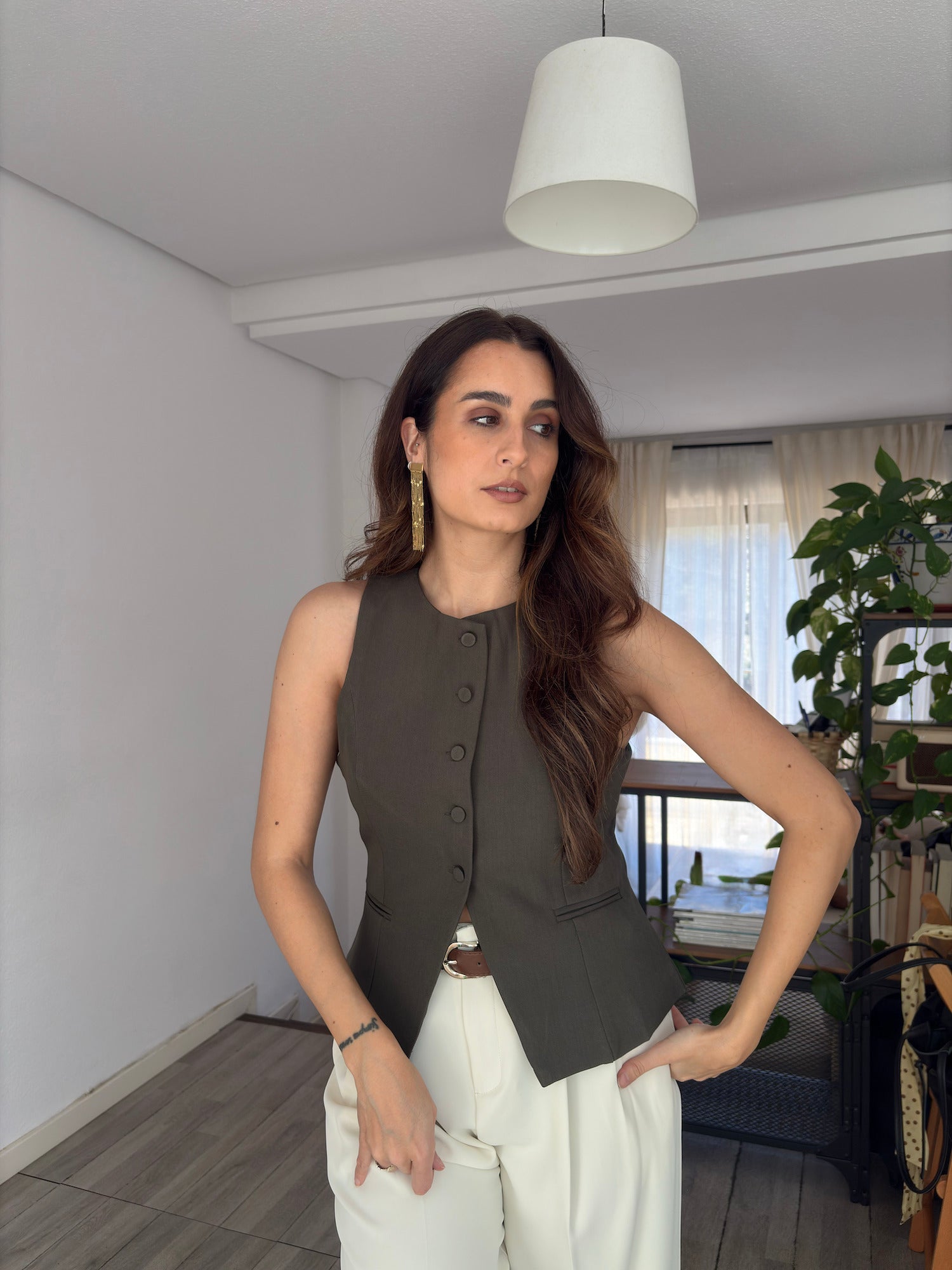 Chaleco de escote redondo. Falsos bolsillos de vivo en delantero. Cierre frontal con botones a juego